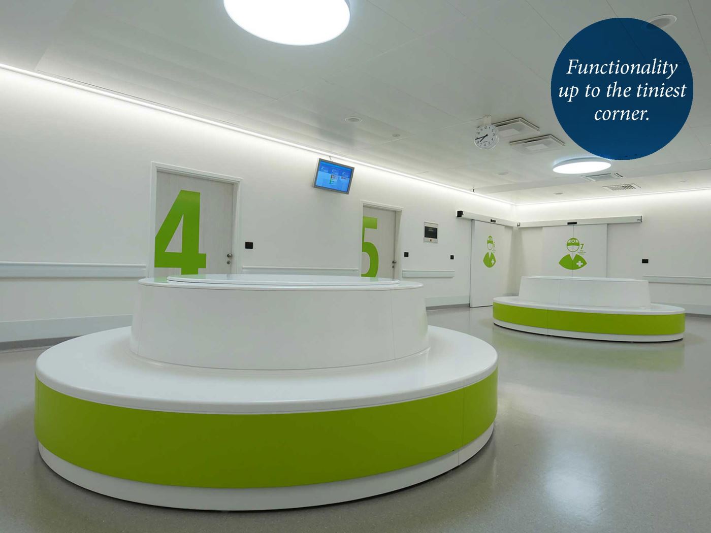 The primary requirement of medical facilities is sterility. That is why we use materials with characteristics that help uphold the highest hygiene requirements. One such material is Kerrock, a universal material for work surfaces that offers high mechanical resistance, is non-porous and impermeable to water, and gives surfaces a lastingly fresh appearance. The Kerrock medical programme offers work surfaces, whose molecular structure mechanically destroys bacteria and prevents them for from evolving further and thus ensures the highest level of hygiene. Although the surfaces made of Kerrock materials are sterile, they offer a wide variety of colors and patterns and bring lots of warmth and vibrancy to the interior.